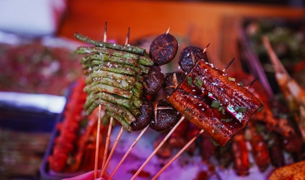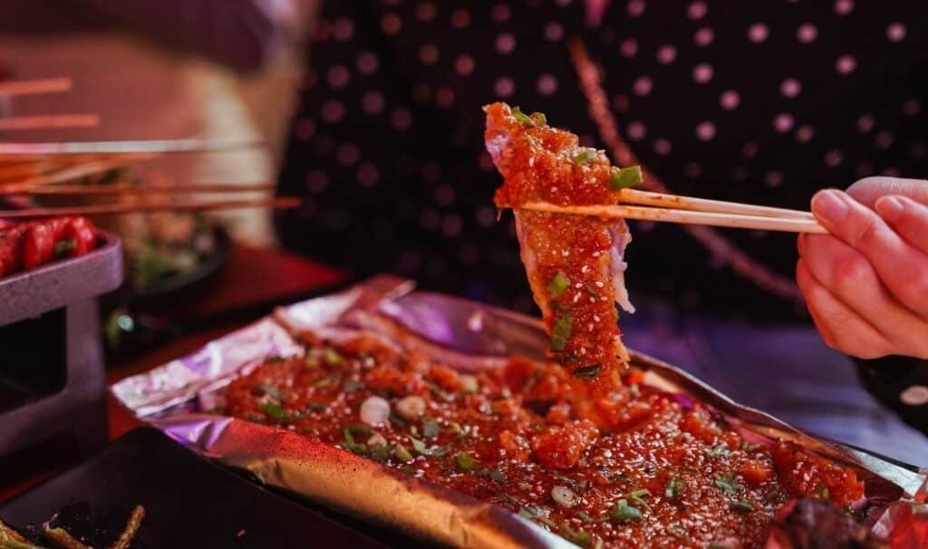「烤铺」的菜单多样丰富,不仅有经典的烤串,还有创新的芸豆蹄粑汤,这是一道软糯脱骨、入口即化的绝妙美食。烧烤的每一口都有其独特的孜然粉和辣椒粉调味,香气四溢,各种肉质鲜美,无骚味。